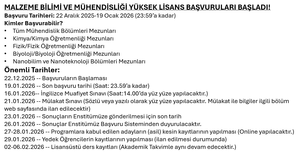 Malzeme Bilimi ve Mühendisliği Yüksek Lisans Başvuruları